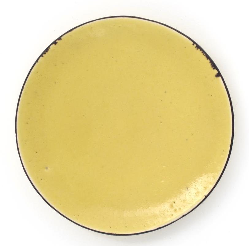 ‡Lucie Rie (1902-1995) a stoneware plate, glazed American Yellow, with a bronze rim impressed seal mark 15cm. diam.