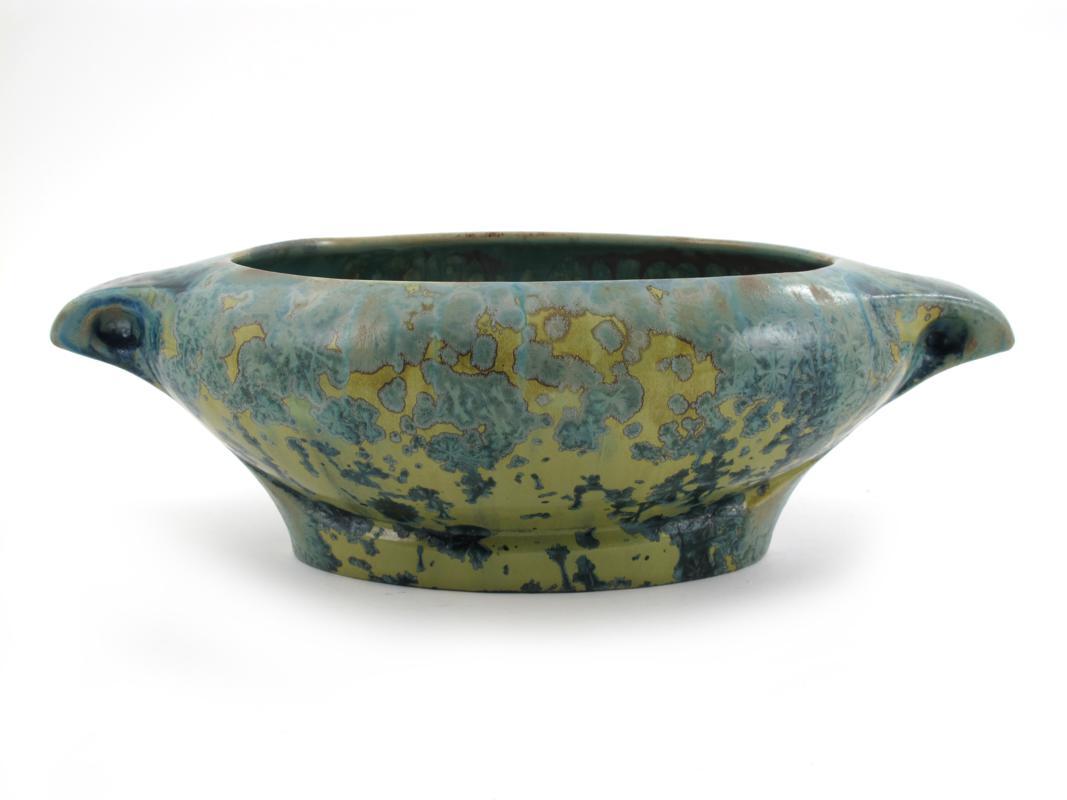 A Pierrefonds Pottery centrepiece, slender elliptical form with pulled handles, covered in a yellow and green crystalline glaze impressed marks, hairlines to top rim 40cm. wide