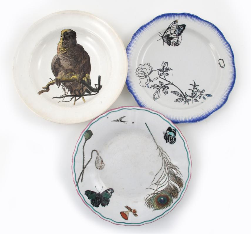 An Aesthetic Movement Minton's Pottery low tazza, designed by William Coleman, printed with flower stems, butterflies and a peacock feather, a Minton's bowl decorated with a parrot, and a Creil Montereau plate designed by Francis Eugene Rousseau, printed marks, small chip to main item, 24.5cm. diam.