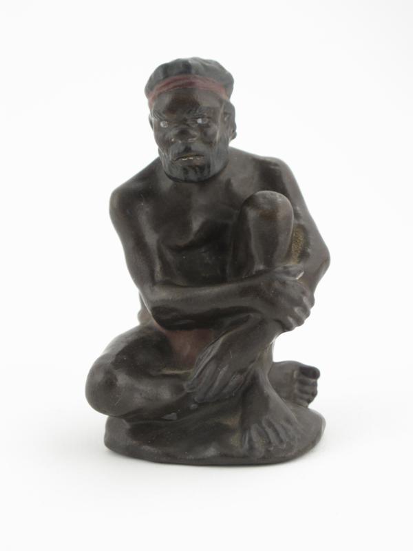 A Darbyshire Pottery Australia, figure of an aborigine, modelled crouched, glazed in colours impressed marks, 8.5cm. high