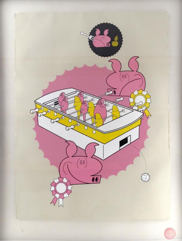 Two Mick Marston limited edition silk screenprints, framed numbered 8/10 and 9/10 with printed chop cipher images 75 x 65cm.