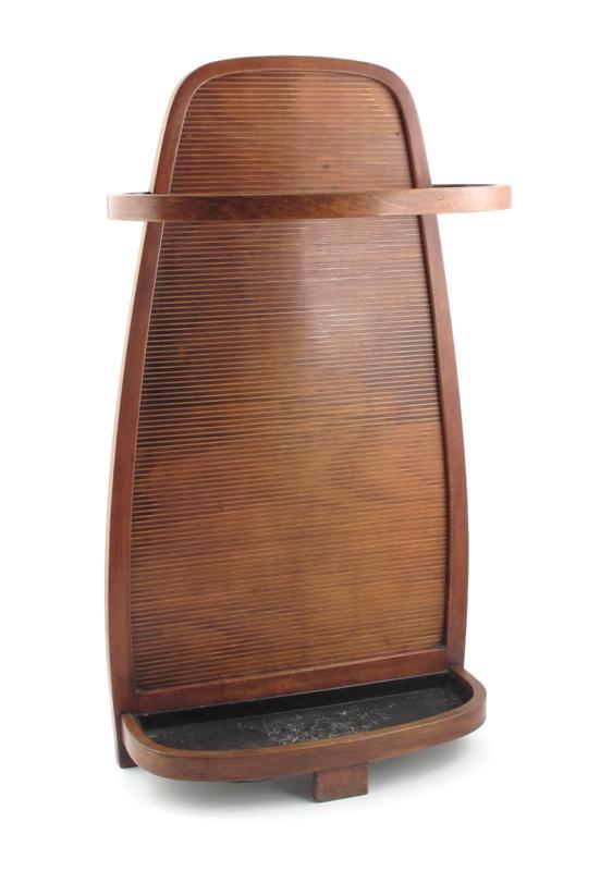 A Thonet bent wood stickstand, rounded rectangular ply back, with enamelled metal drip pan unsigned 91cm. high