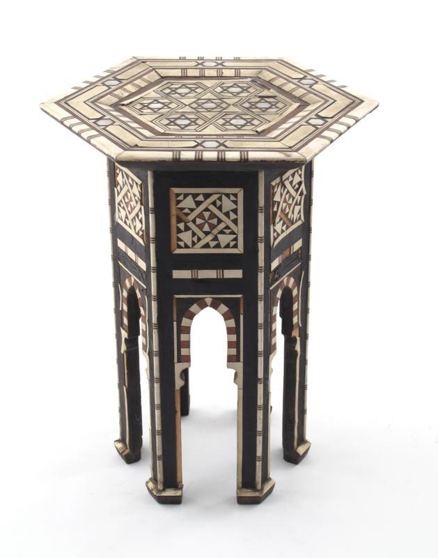 An inlaid bone and mother of pearl Anglo-Moorish small table, possibly retailed by Liberty & Co, hexagonal form unsigned 32.5cm. high