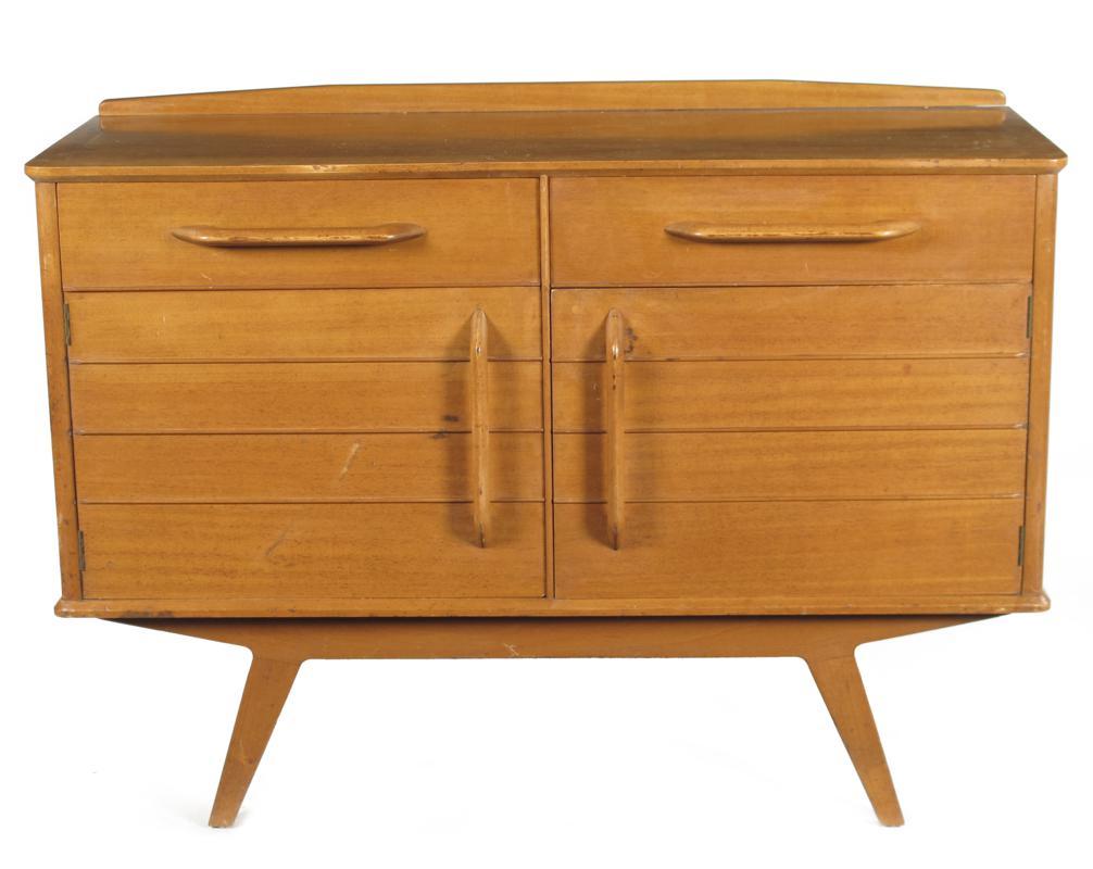 An E Gomme Ltd Redford mahogany sideboard, the design attributed to Leslie Dandy, on flaring legs, two drawers with cupboards below, applied label to inside of door 125cm wide, 87cm high