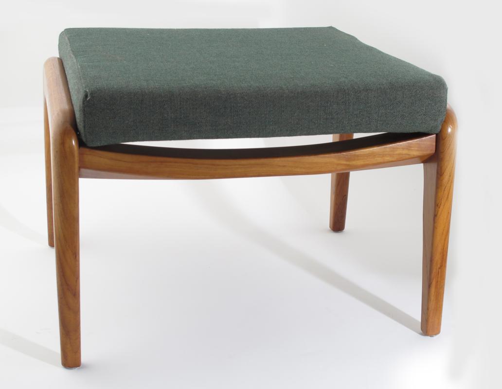 A teak footstool, possibly American, with sprung seat and padded cushion, unsigned, applied regd plastic label 57cm. wide