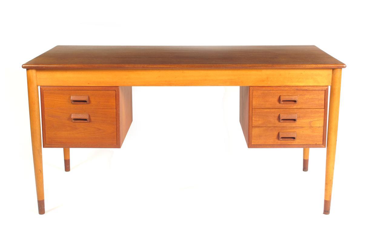 A Danish teak and rosewood desk designed by Hans Wegner, with twin-banks of drawers, stamped made in Denmark 148cm. wide