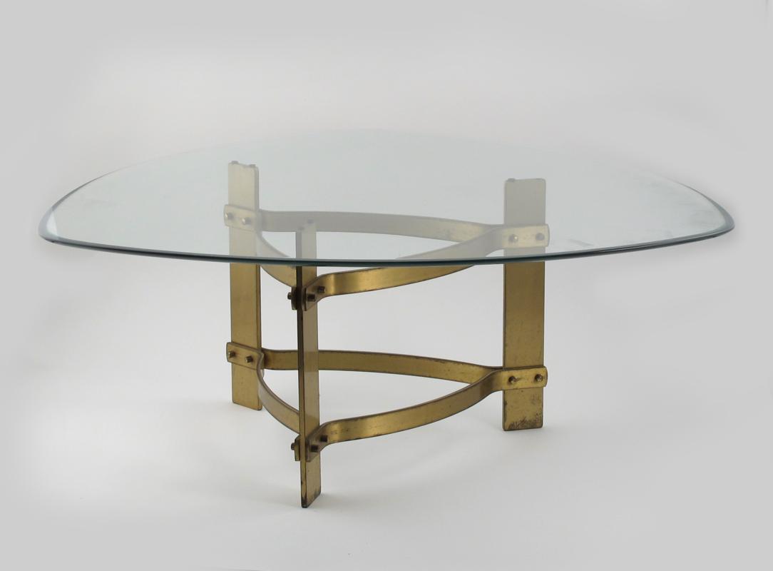 A glass topped brass low table, rounded triangular top, unsigned 91cm. diam.