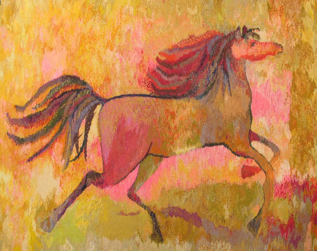 An embroidered wall hanging of a galloping stallion, 1970s, in shades of yellow and pink unsigned 148 x 130cm.