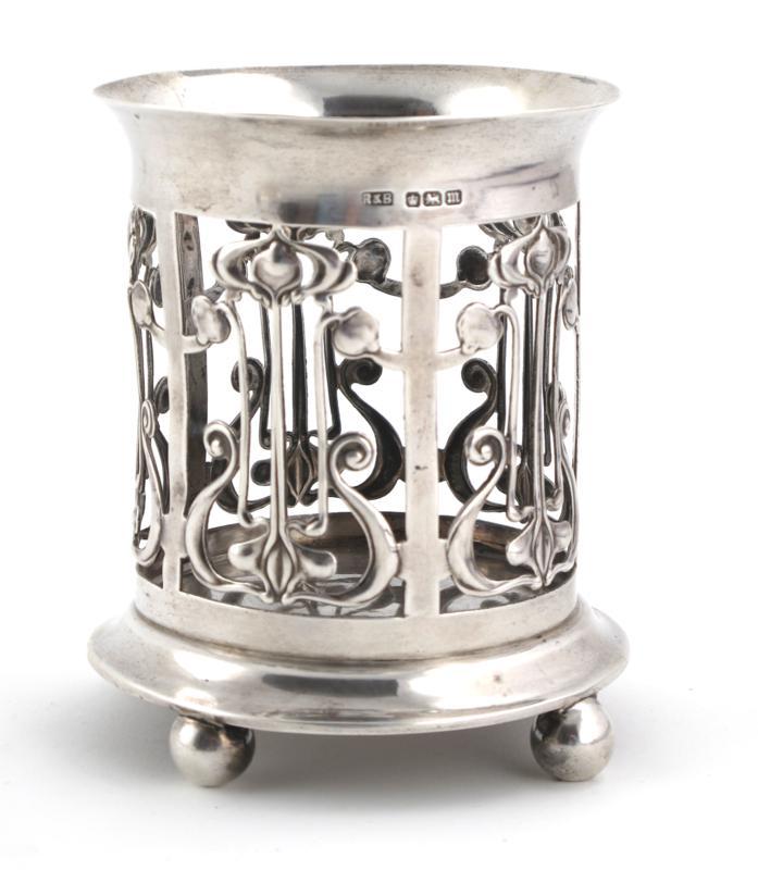 A Roberts & Belk silver preserve jar holder, model no.6589, pierced, cylindrical form, decorated with stylised flower stems, retailed by Barraclough & Sons retailers mark, stamped R & B London 1927 and marks to base, 11.5cm. high