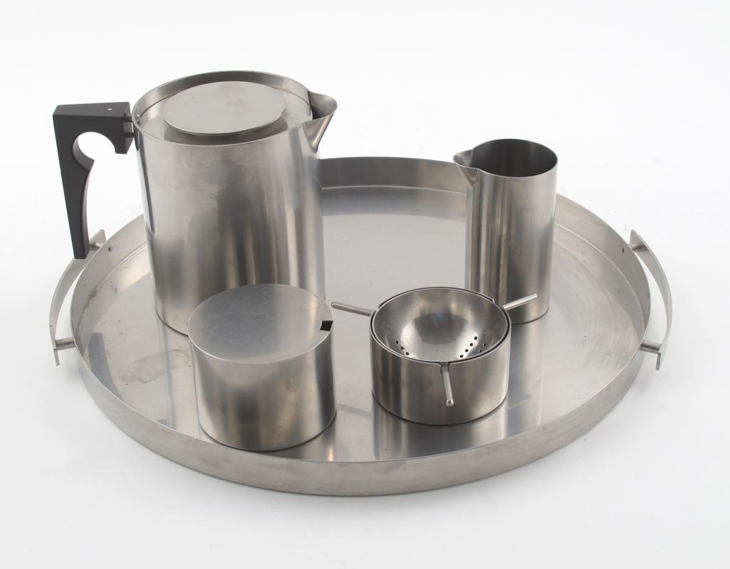 A Stelton Denmark, Cylinda Line stainless steel tea/coffee set designed by Arne Jacobsen, comprising; hot-water pot and cover, milk-jug, sugar basin and cover, strainer and stand on a twin-handled circular tray various factory marks, tray 35.5cm. diam, coffee pot 12.5cm. high