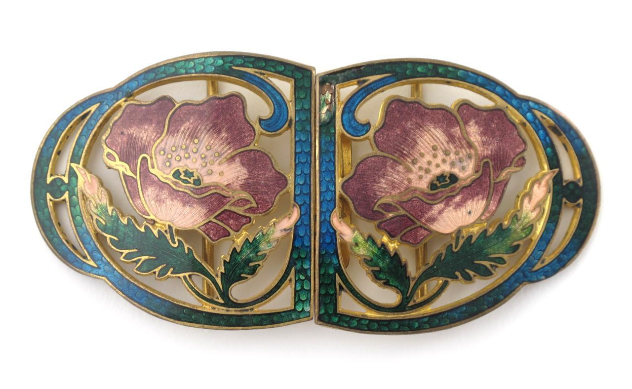 An enamelled metal belt clasp, pierced form, each half an opium poppy stem, enamelled pink, blue and green stamped marks to back 9.5cm. wide