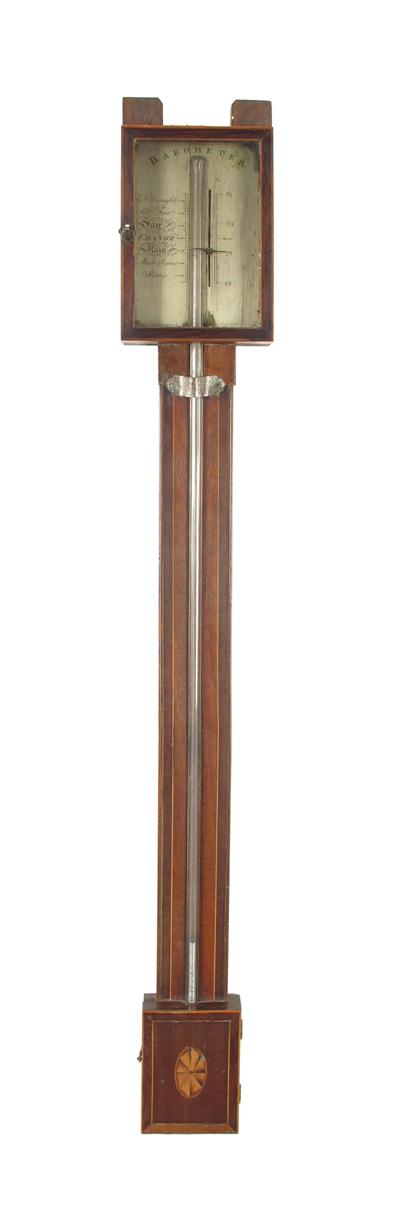 A mahogany stick barometer, with stringing, banding and paterae inlay, the silvered dial inscribed BAROMETER above the tube with scales either side, enclosed by a glazed door, the base with hinged cistern cover, 36.75in (93.5cm) h.