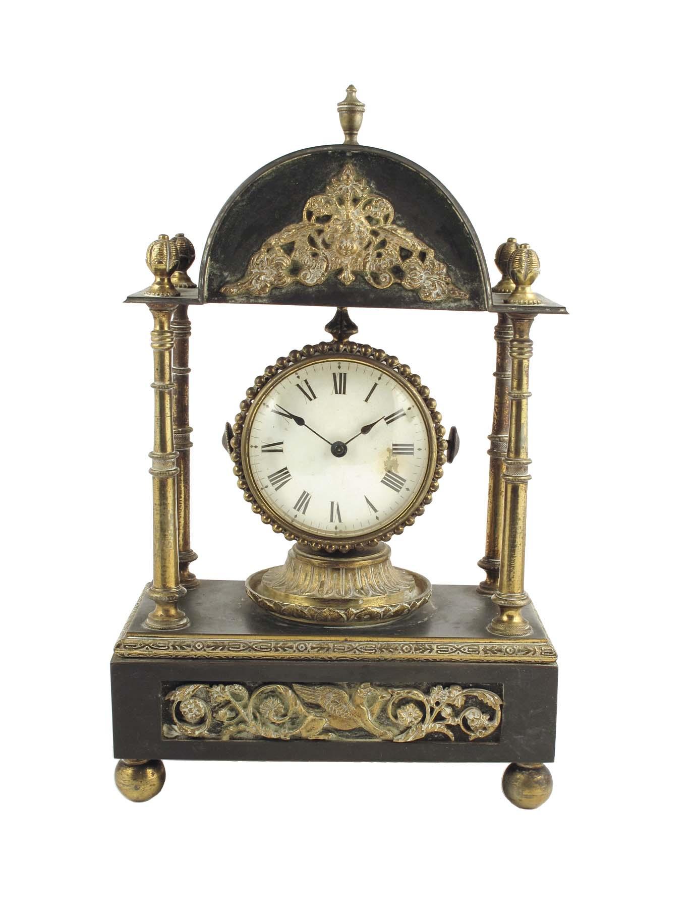 A gilt brass and bronze portico mantel timepiece