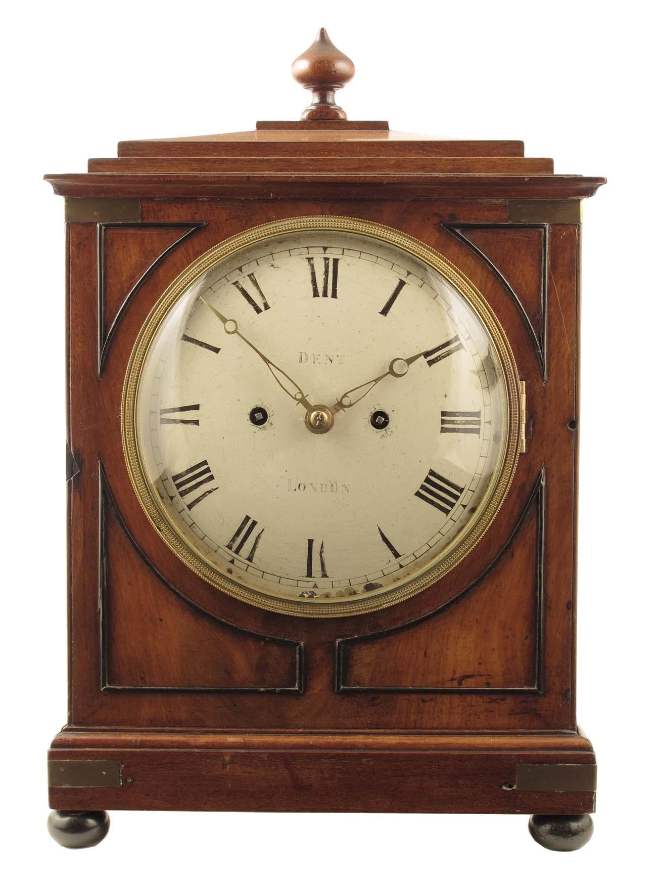 A mahogany bracket clock, with repeat, with ebonised beading, the twin fusee movement striking on a bell, the arched plates with riggle engraving to the back signed Mc Levin royal exchange LONDON, to a painted circular dial inscribed DENT, LONDON, to a cast beaded bezel, the case with brass corner mounts, a stepped top with later finial and pierced brass church window panels, 16.5in (42cm) h.