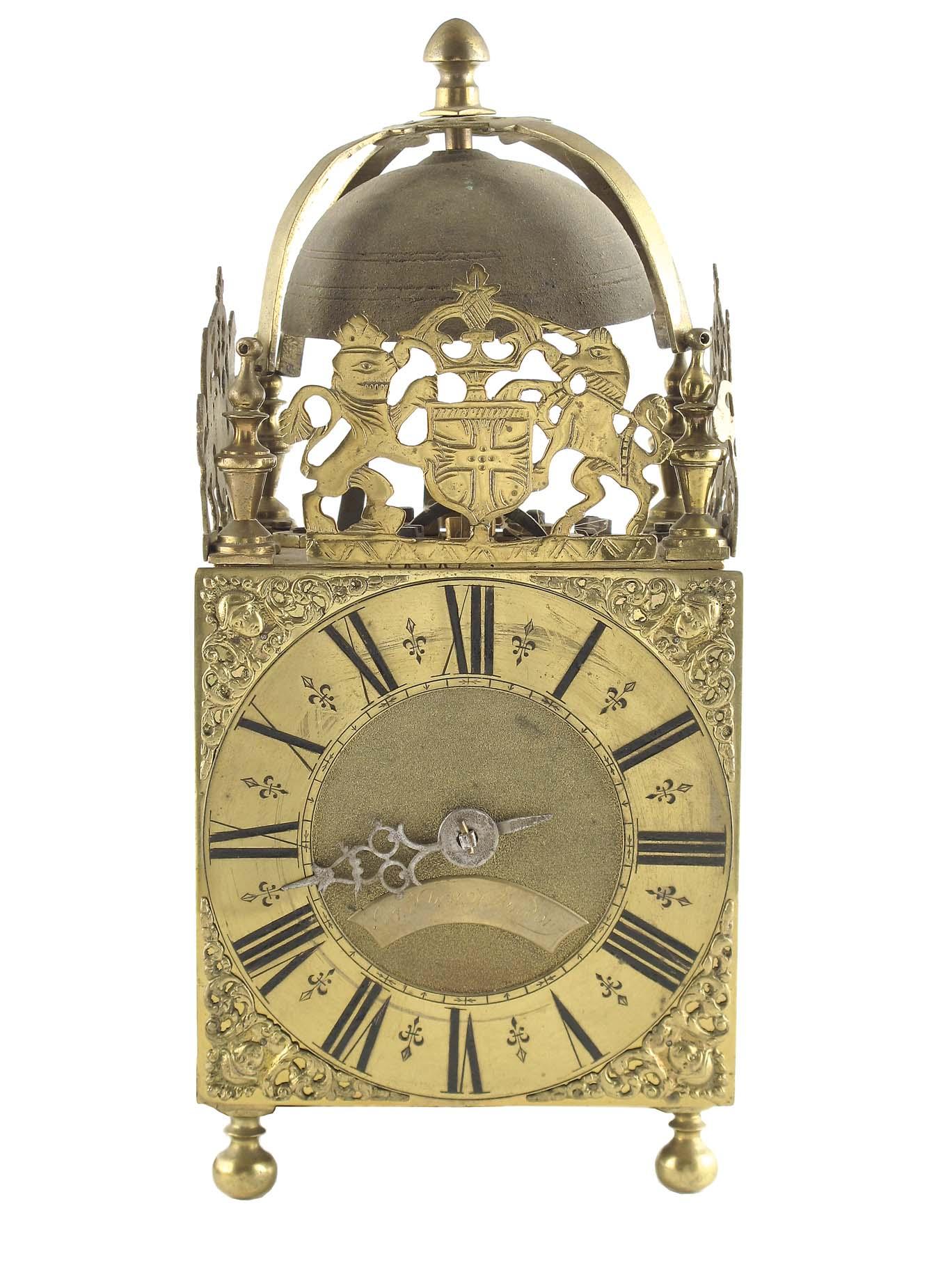 A striking lantern clock, 6 inch square dial signed on a plaque in the matted centre Jams. Drury, London, anchor escapement with long pendulum, lacking, and unicorn frets, in a posted frame case surmounted by bell, 13in (33cm) h.
