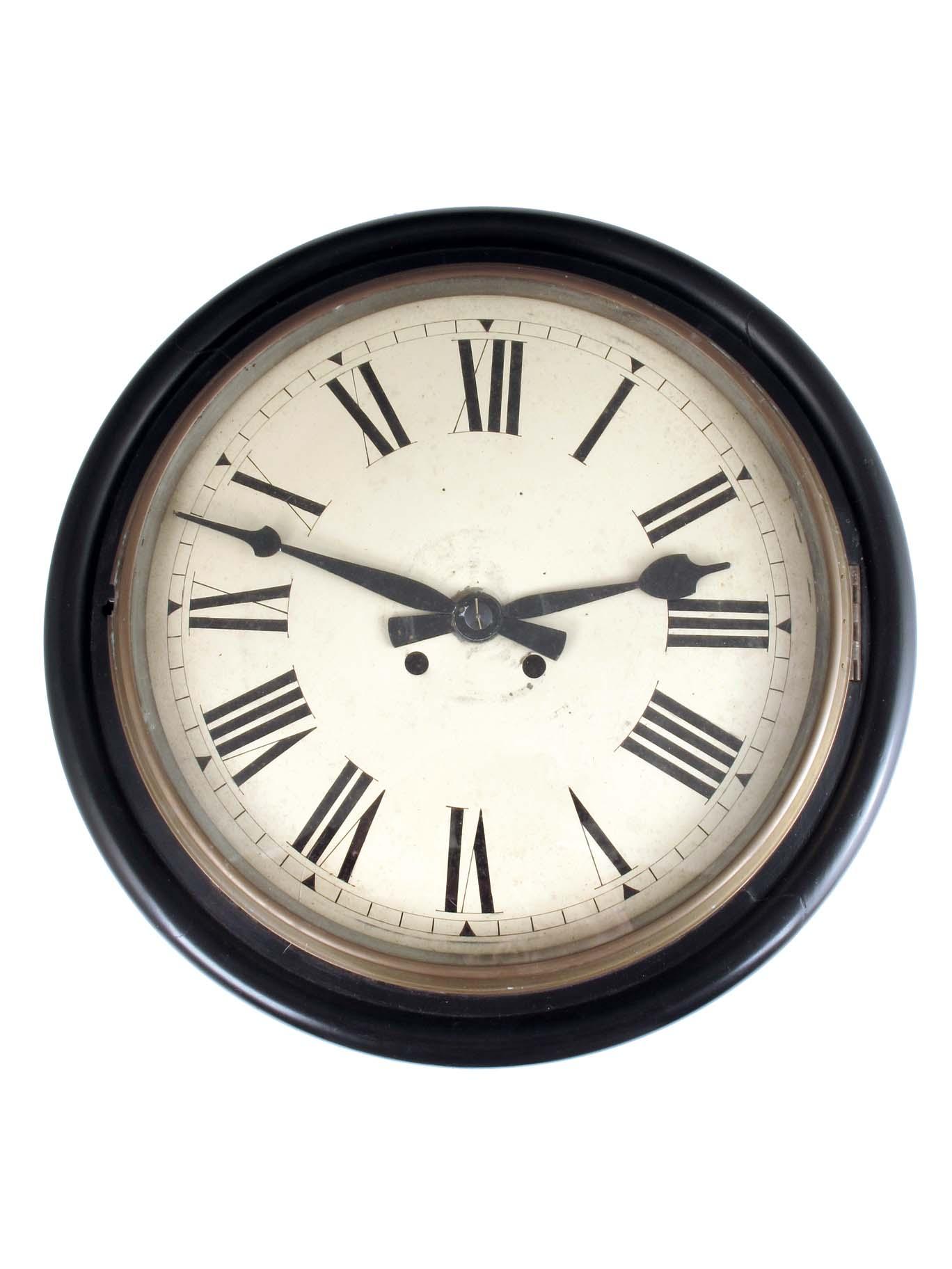 An ebonised wall clock, the lever escapement striking on a gong with a painted 12.75in dial, 15.75in dia.
