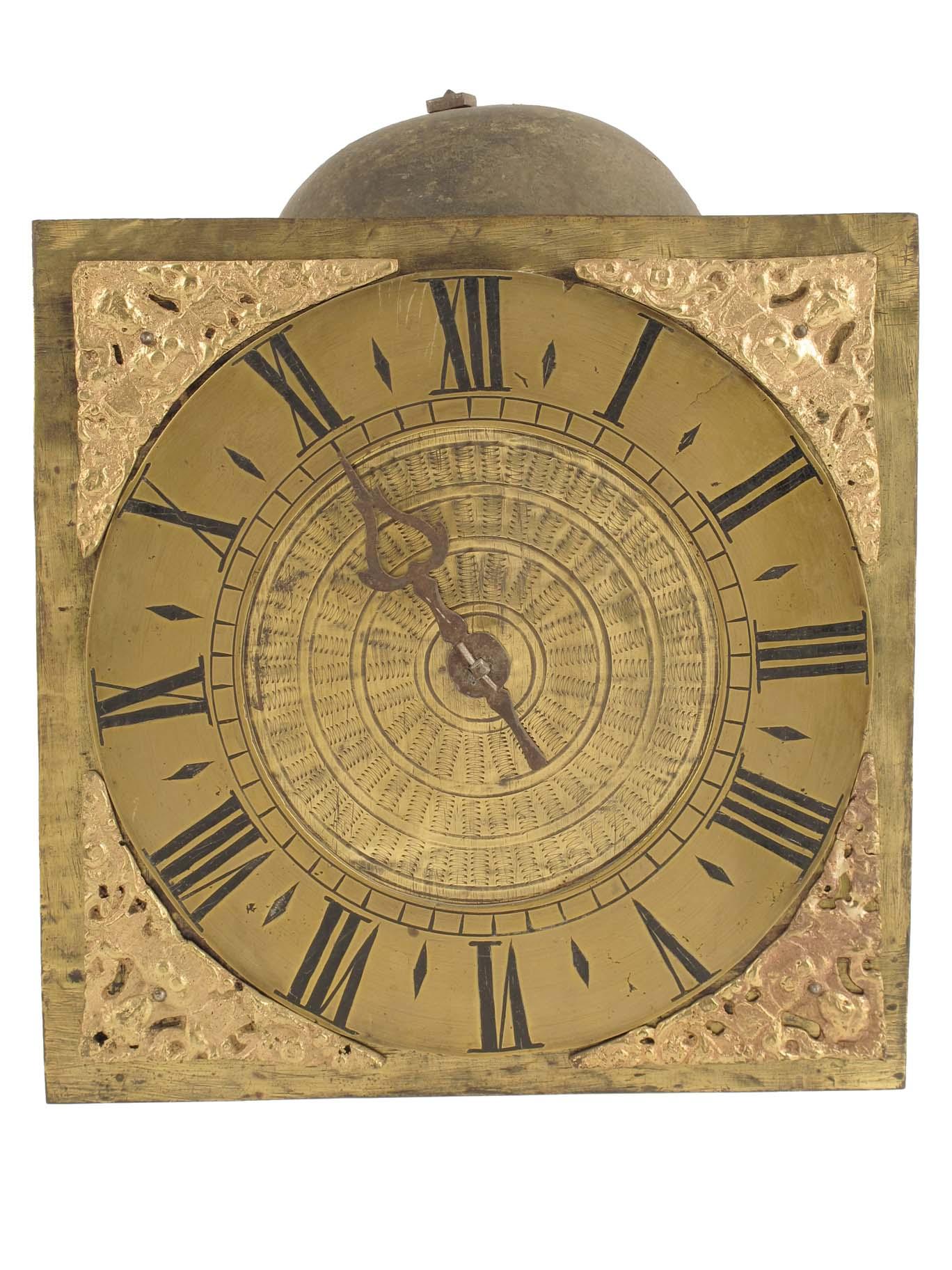A hook and spike thirty hour movement, with an anchor escapement striking on a bell, with a 9in square brass dial and brass chapter ring with a single hand