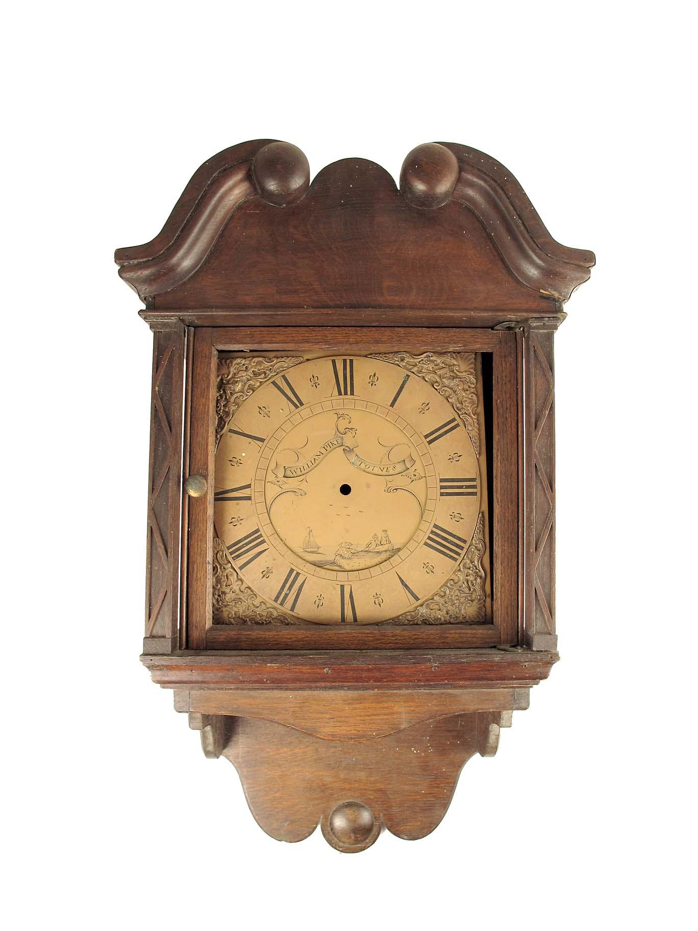 A square brass 10 inch dial, with chapter ring and spandrels, the centre engraved figures looking out to sea above pierced aperture signed WILLIAM PIKE, TOTNES, with movement parts including plates and bell, an oak hood and bracket.