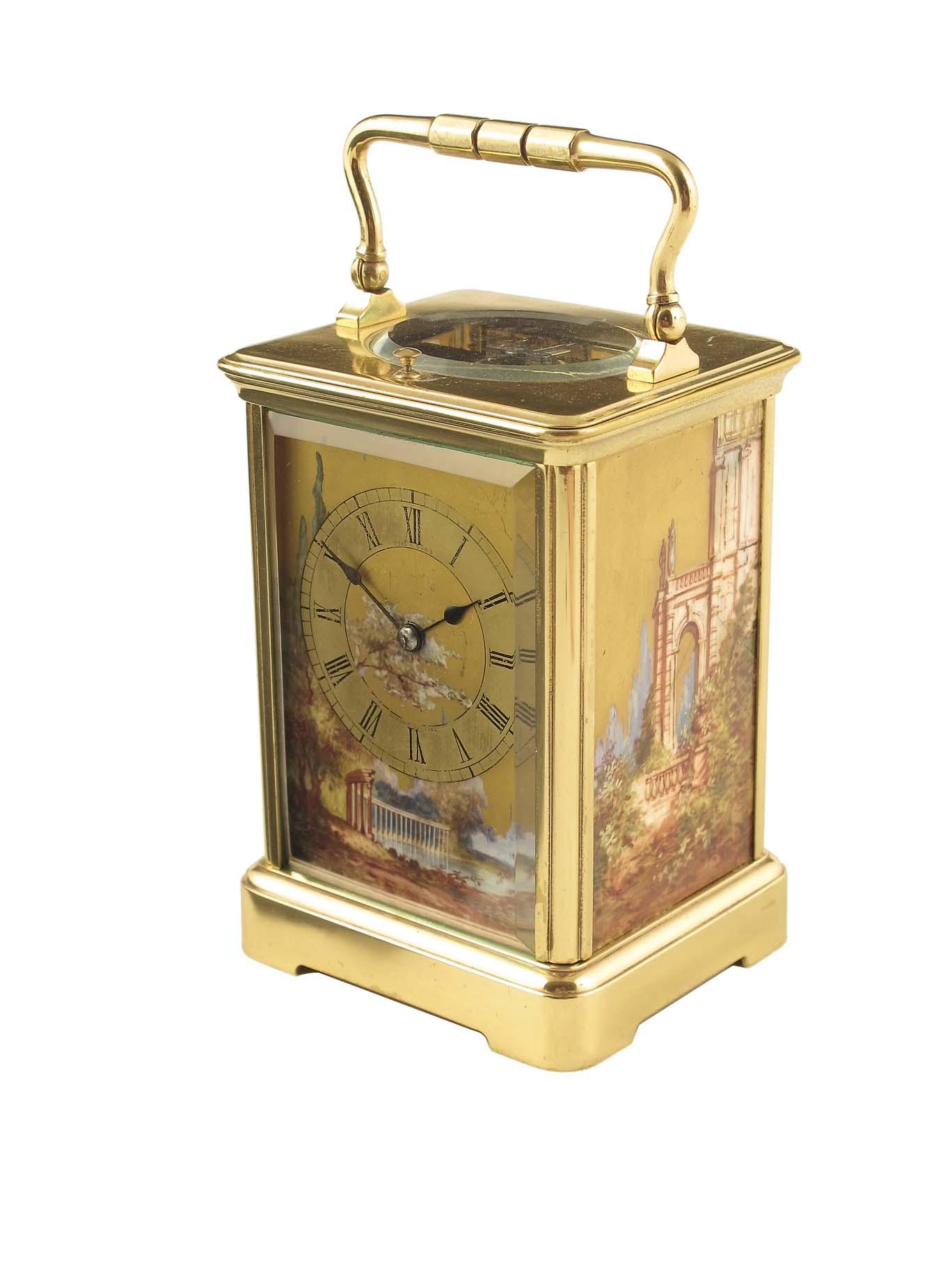 A porcelain mounted petite sonnerie carriage clock, stamped Richard & Cie, no. 269, lever platform, quarter chiming on two gongs, the dial and sides decorated with classical ruins and vegetation against a gilt ground, faded signature of Reid & Sons, Newcastle, in a corniche case with selector lever in the base, 6in (15cm) h.