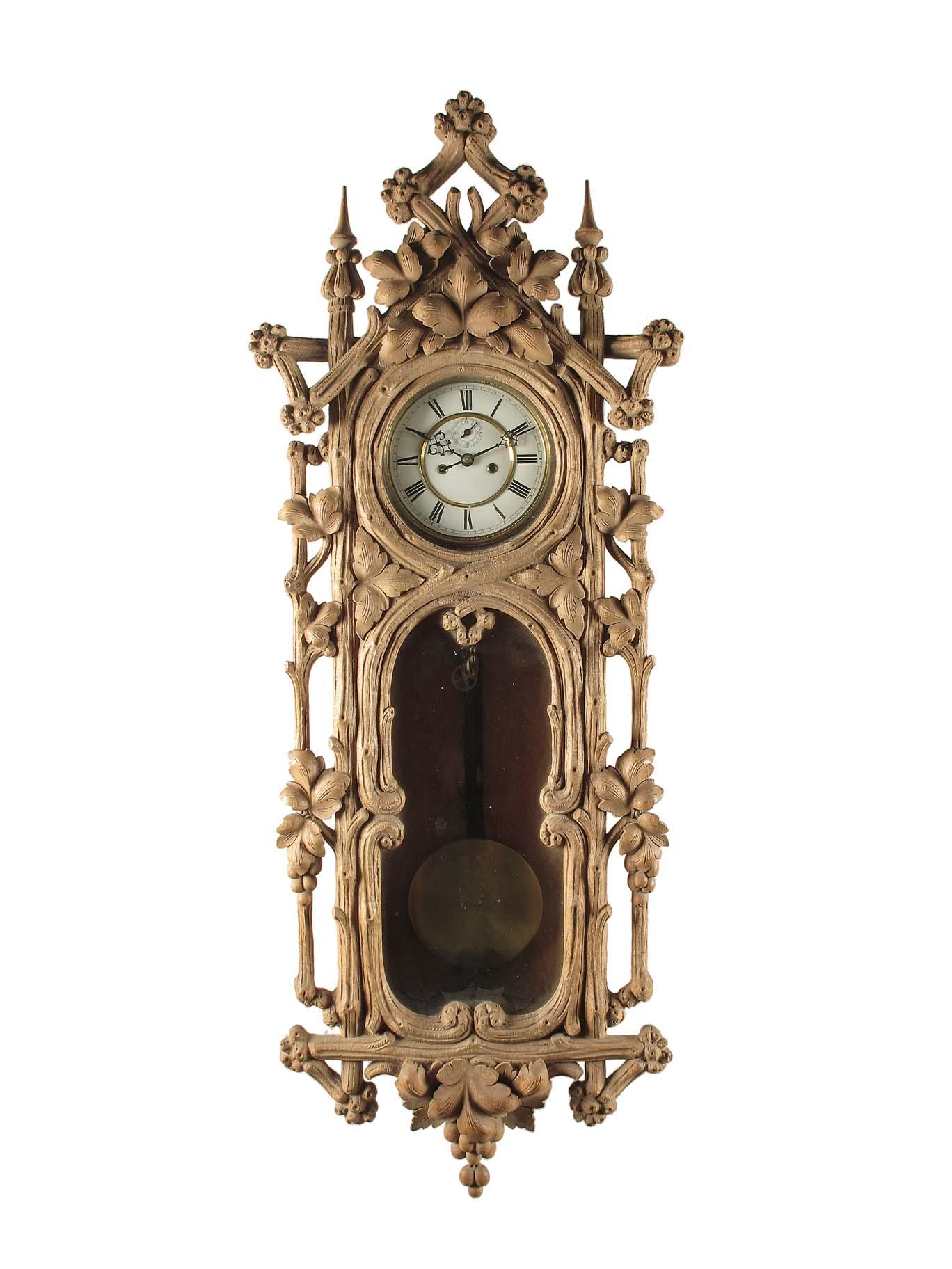 A carved oak regulator type wall clock, with a twin barrel movement by Gustav Becker, No. 773139, striking on a gong, to a two piece enamel dial with subsidiary seconds, the case carved fruiting vines, 46in (117cm) h. Wooden rod pendulum, two weights, winding key.
