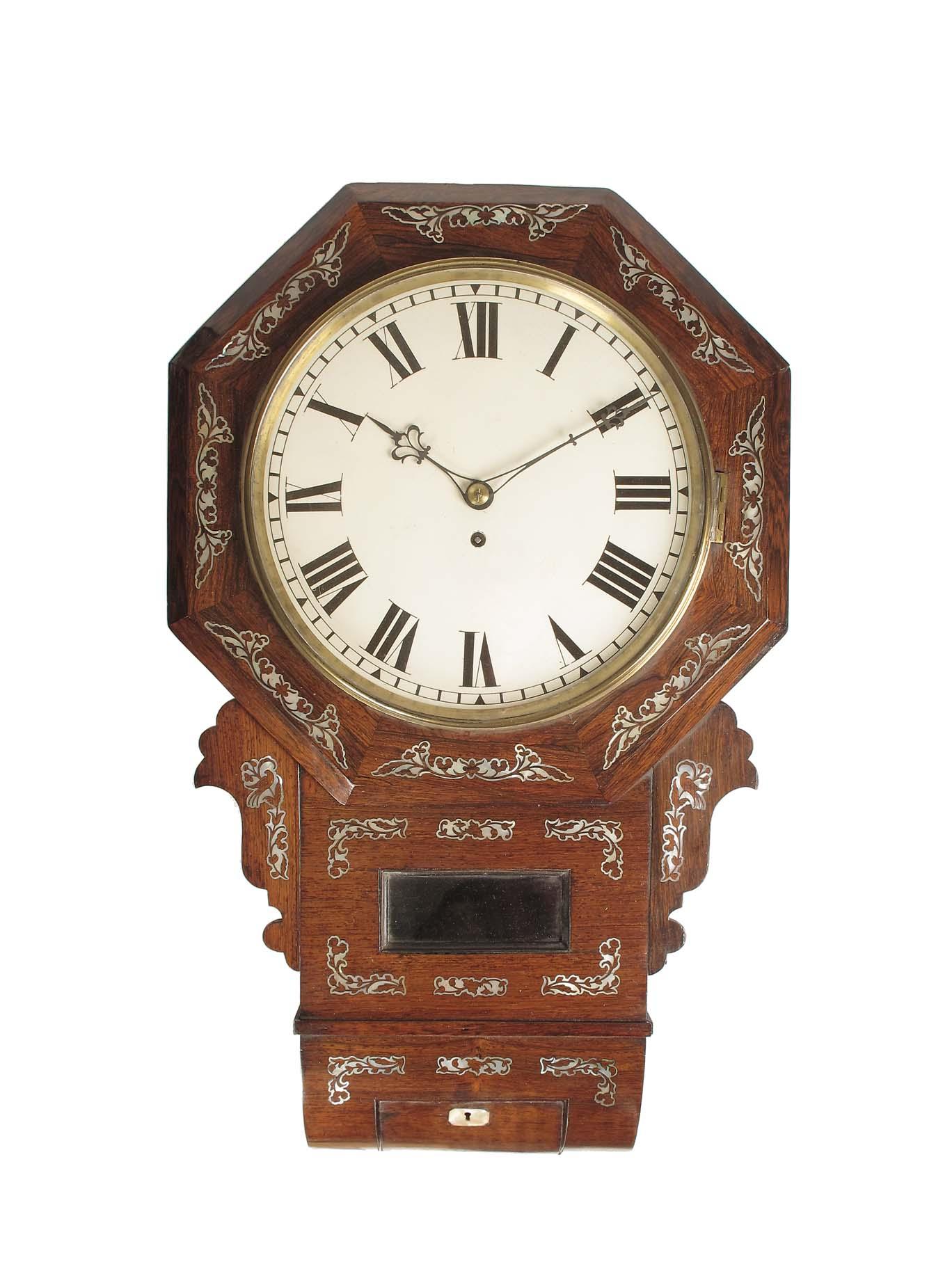 A Victorian rosewood and mother of pearl inlaid octagonal drop dial