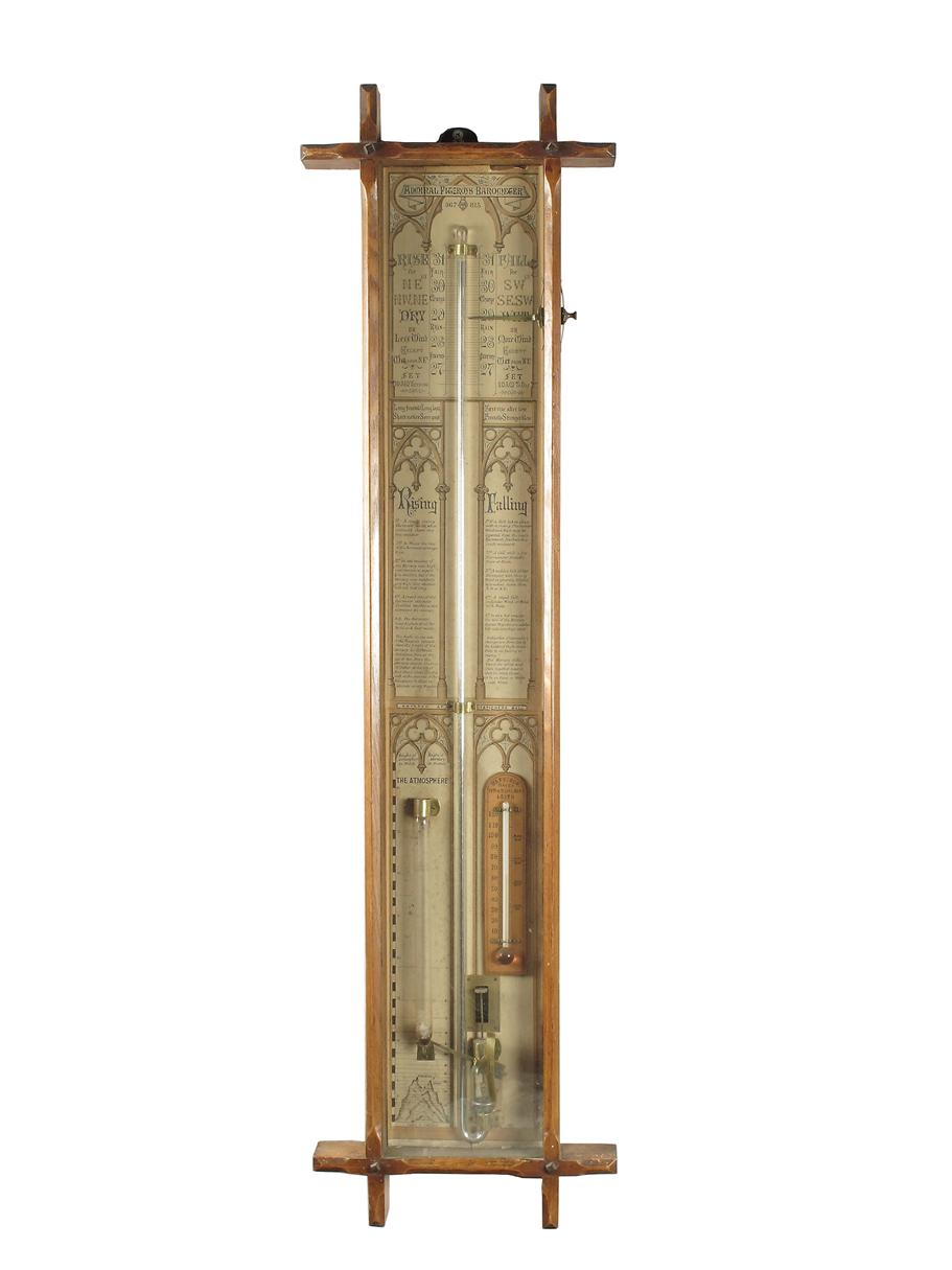An oak cased Admiral Fitzroys barometer, with printed paper dials, brass marker to the right side, left one fallen to base, the thermometer marked MATHESON. MAKER TO THE ROYAL NAVY LEITH, 41in (104cm) h.