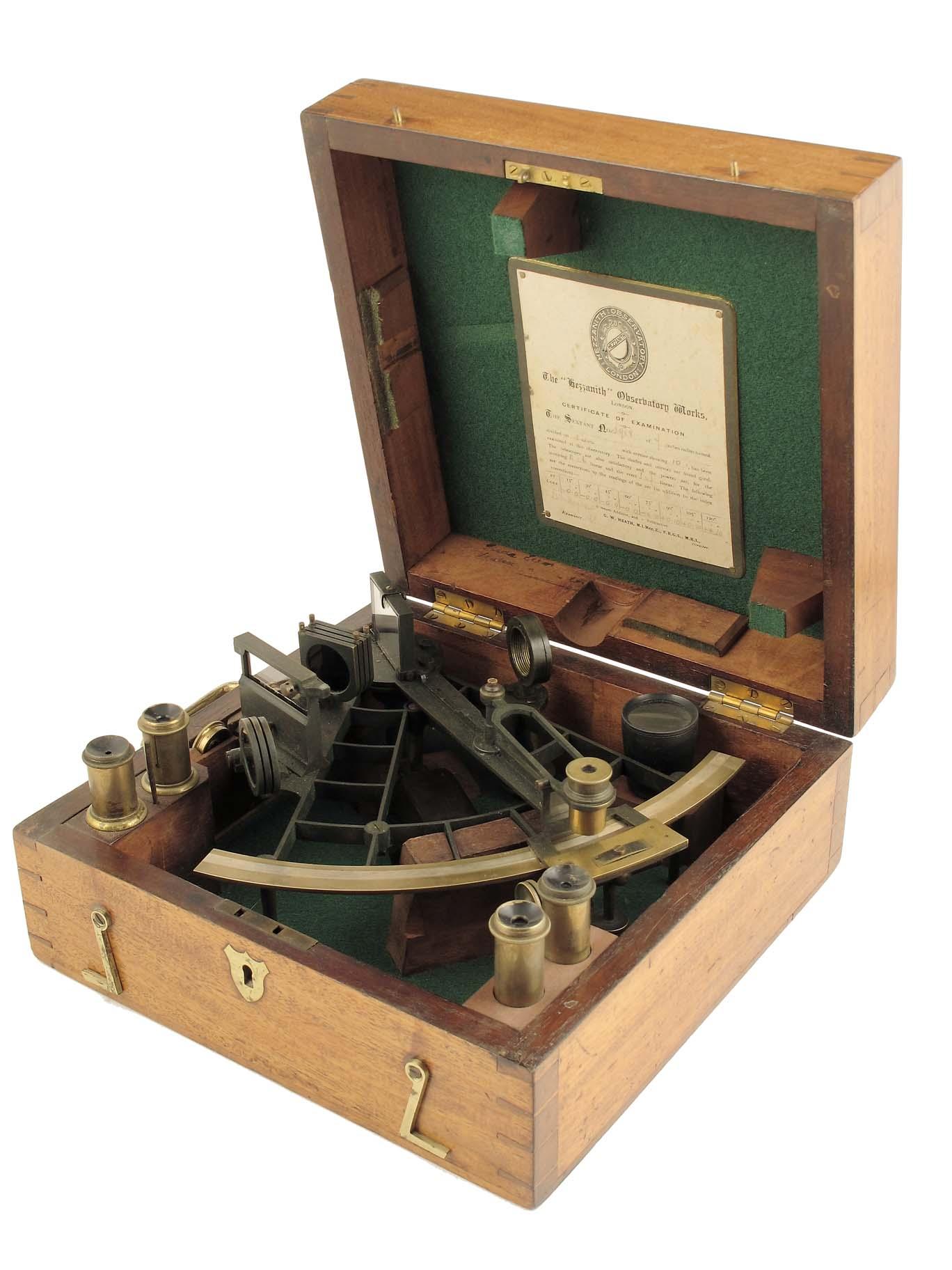 An ebonised and brass sexant, with a silvered vernier marked S988, with lenses in a fitted mahogany case with Hezzanith Observartory Works London, dated 25th May 1920.