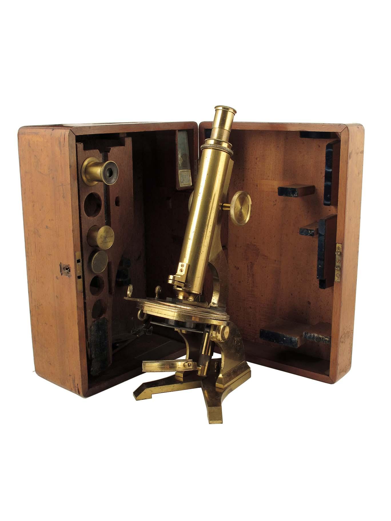 A lacquered brass microscope, with rack and pinion focusing with an oval stage and plano/convex mirror with a Y shape base inscribed M. Pillscher, 398, Oxford Stt, London, 120, the mahogany case with two eye pieces and lenses, 13.25in (33cm) l.