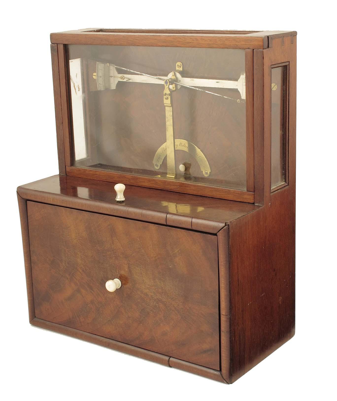 An early Victorian Fox's Balance by William Wilton, Cornwall, brass and silvered with marked scale either side, with curved brass plaque inscribed FOX's Balance by Wilton, ST DAY Cornwall, fitted in a mahogany case with a rising glazed from the base with a drawer, with printed trade label to reverse W.WILTON, MATHEMATICAL Philosophical & Optical Instrument Maker, ST DAY CORNWALL..., with ivory handles, the reverse with a brass needle and ivory scale marked 30-0-30, 12in (30.5cm) h.