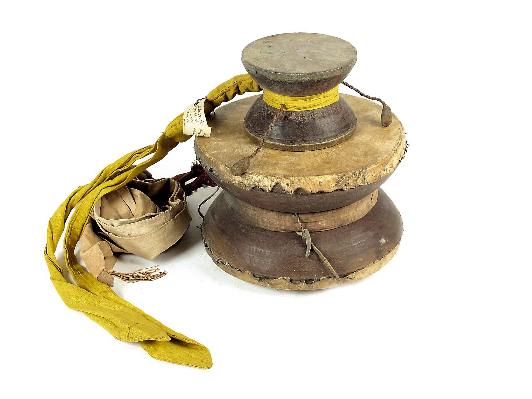 Two 19th century Tibetan hand drums, skin covered and with fabric, with an old label with decription and dated '1905', 8in (20.5cm) dia. (2)