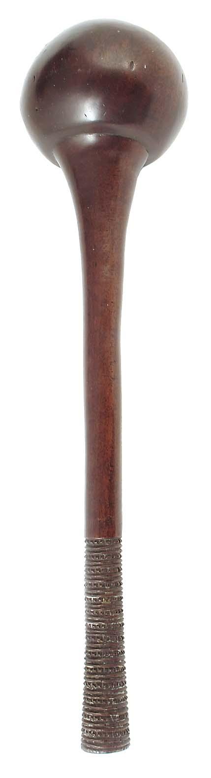 An early 19th century Fijian throwing club, ula, with a round head, unusually carved with a Maori design handle of twin lines and beads, 17in (43cm) l.