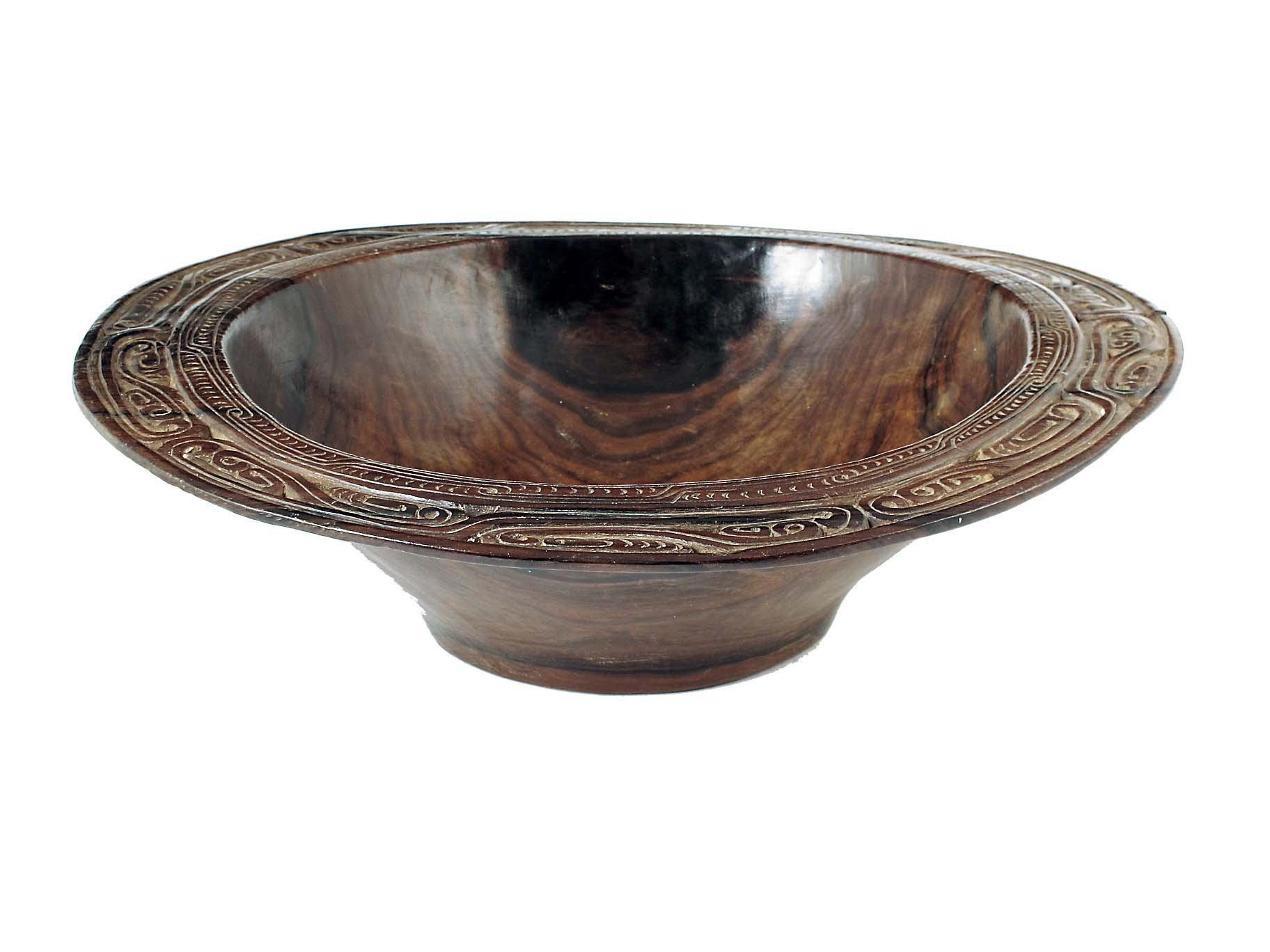 An Oceanic carved hardwood bowl, with a flared rim having pierced scroll decoration, 14.25 x 13in (36 x 33cm)