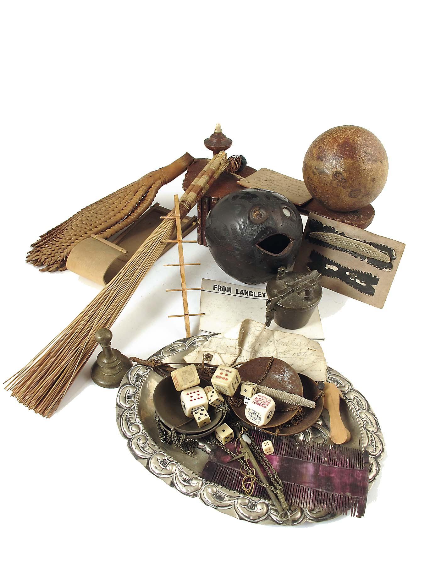 A collection of tribal items, including a 19th century Malay shoe (with old label), a carved coconut, other tribal items with labels and a collection of dice. (A lot)