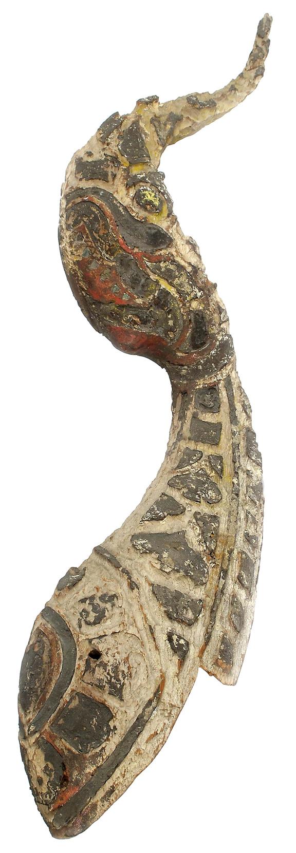 A carved and polychrome decorated Thai Lamyong, an ornamental gable end from the roof of a Buddhist Wat, late 18th / early 19th century, 64in (162.5cm) l.