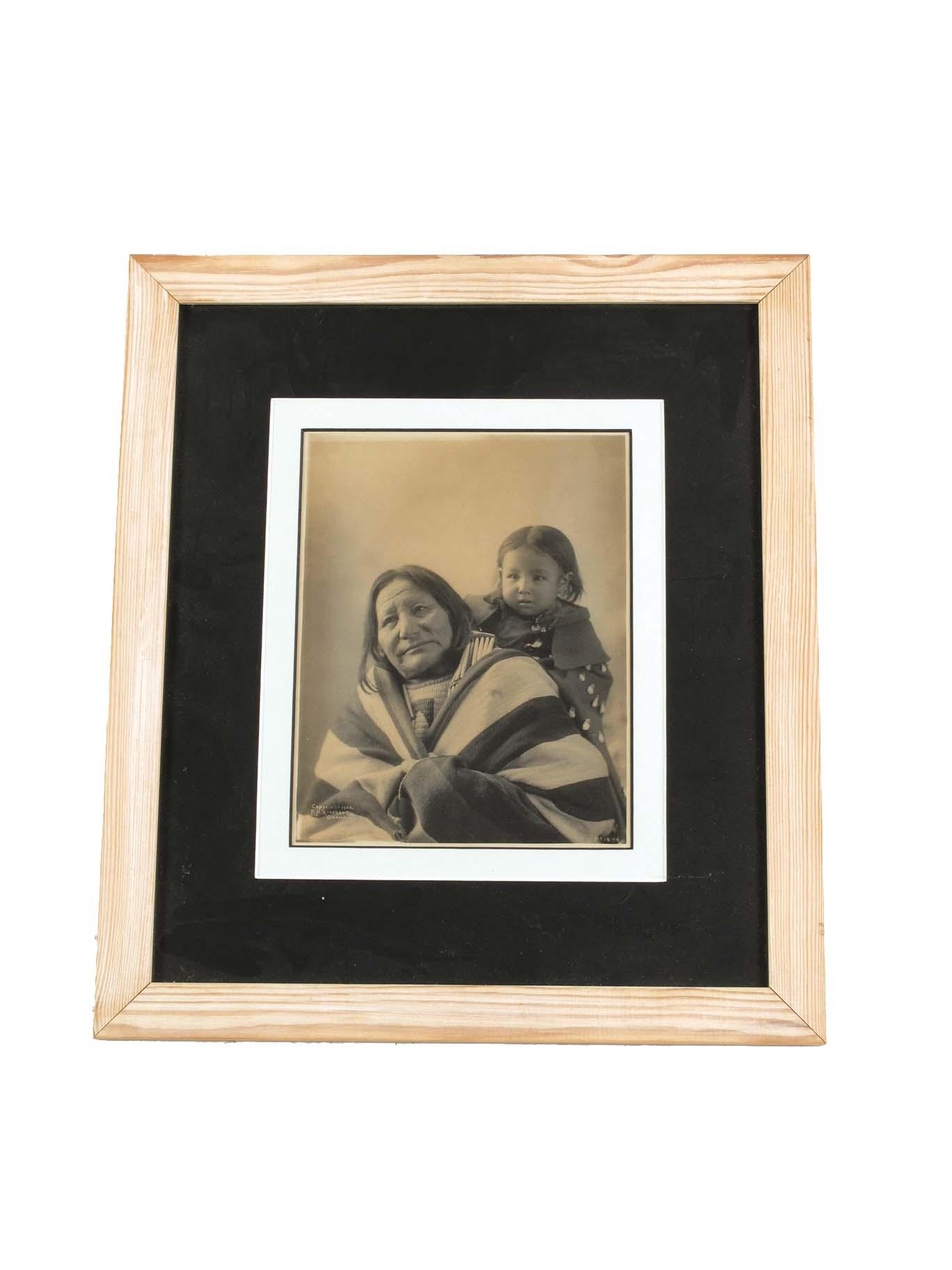 A photograph of a Native American Indian and child, by Frank A. Rinehart and Adolf F. Muhr, circa 1900, 9 x 7in (22.7 x 17.7cm) in a modern glazed frame.
