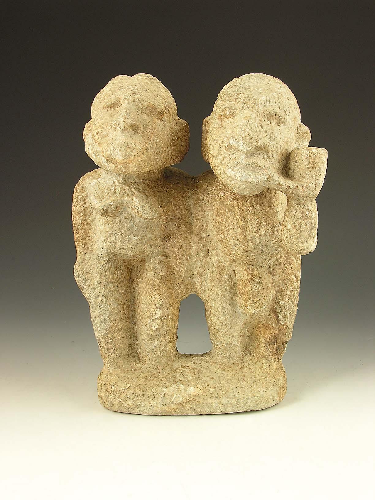 A carved stone group of a naked man and a woman, he smokes a pipe, possibly South American,14in (35.2cm) h, 10in (25.3cm) w.