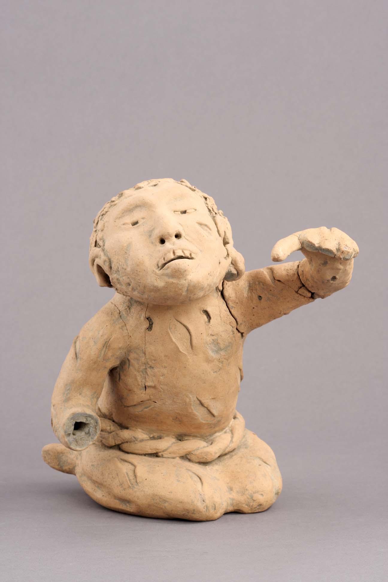 A pottery kneeling offering figure, with raised arm, cavity to back, signs of sacrificial cutting, 9.1in (23cm) h, 7.4in (19cm) w, 6.2in (16cm) d. Old break to right arm.