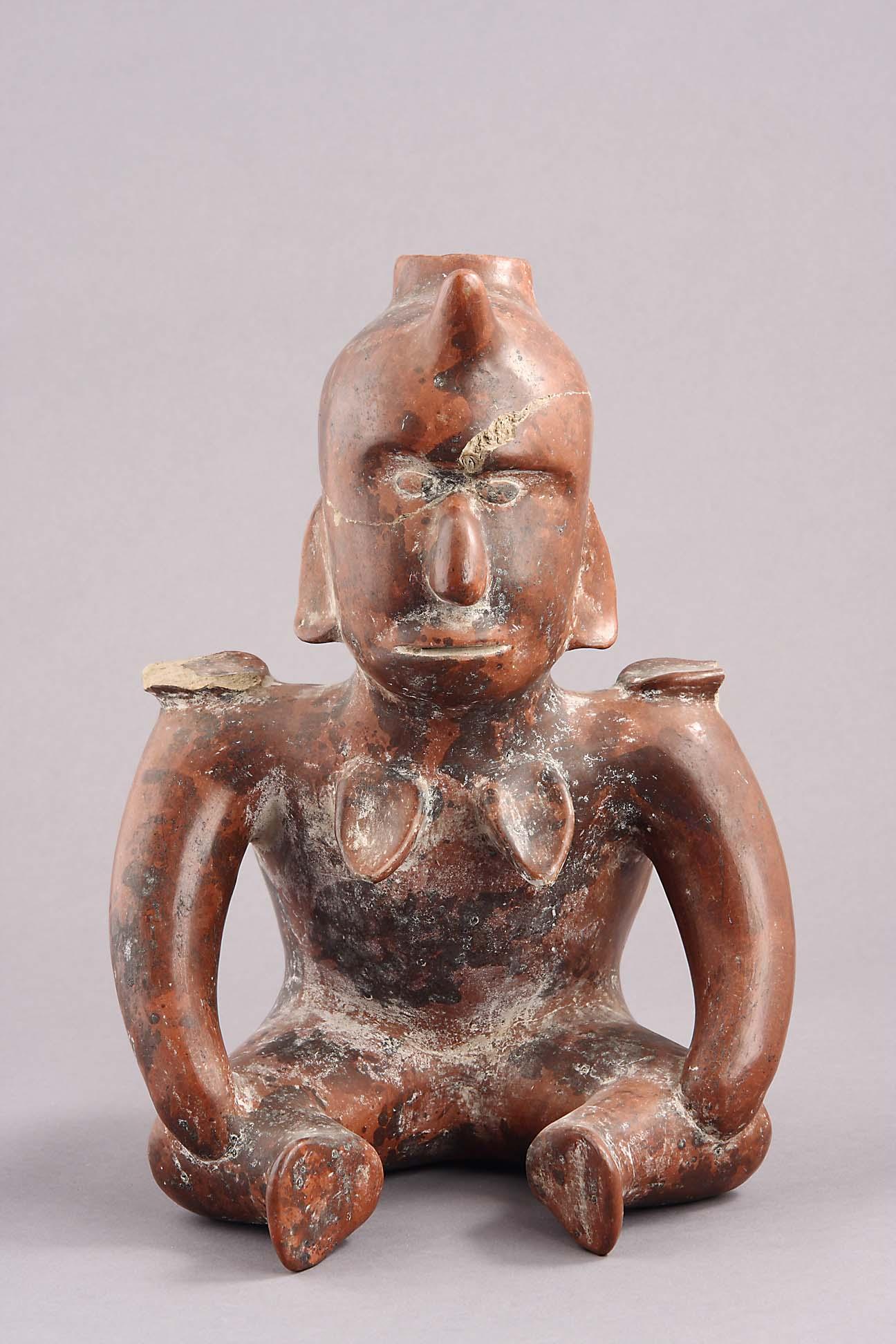A pottery seated figure, with arms resting on knees, 12in (31cm) h.