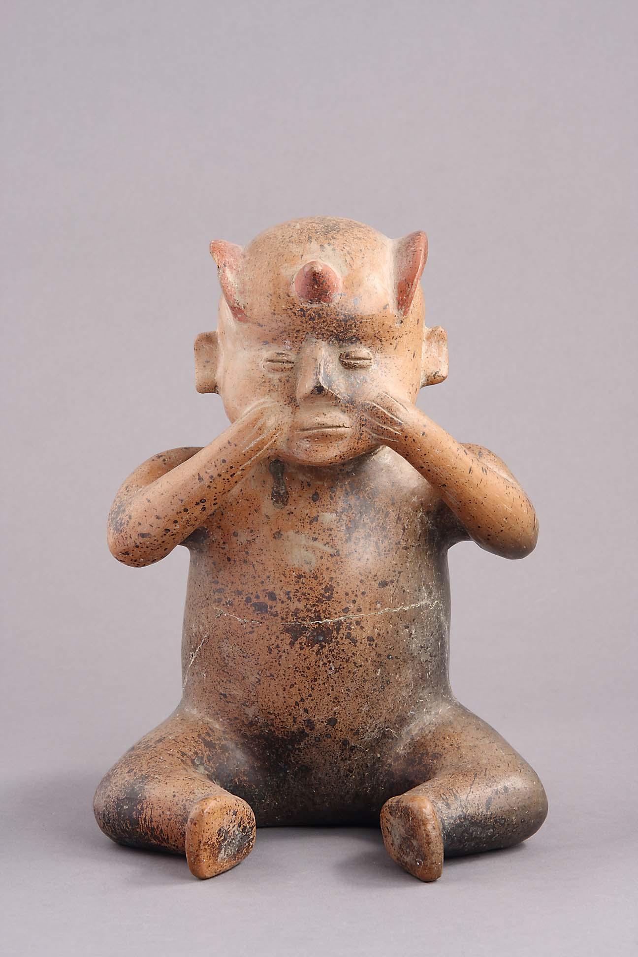 A pottery seated figure, with arms raised to face, old collection number to back '48', 12.in (30.5cm) h.