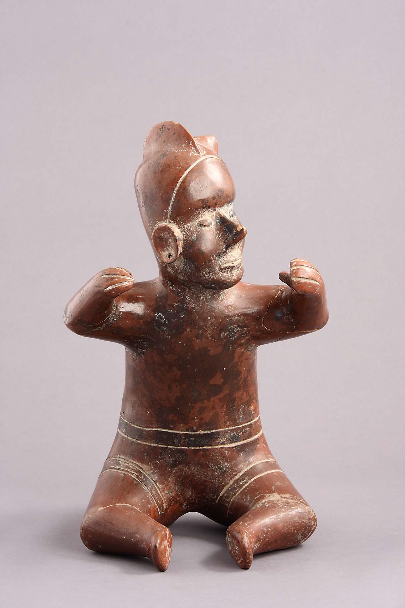 A pottery seated figure, with raised hands and head turned to the left, 15.3in (39cm) h.