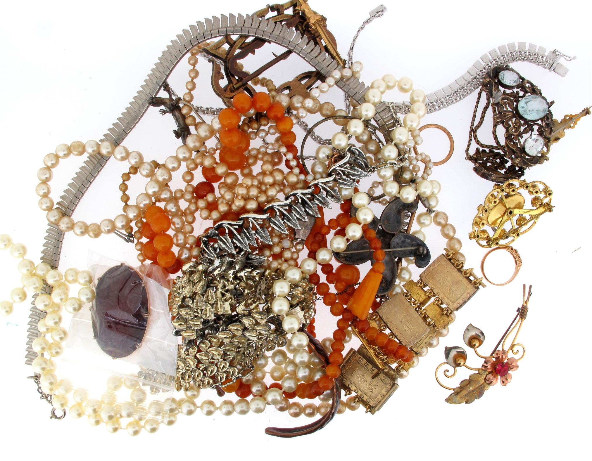 A leather jewellery casket containing various items of jewellery, costume jewellery etc including a carved deep red amber set gold brooch and a 9ct gold pincer.