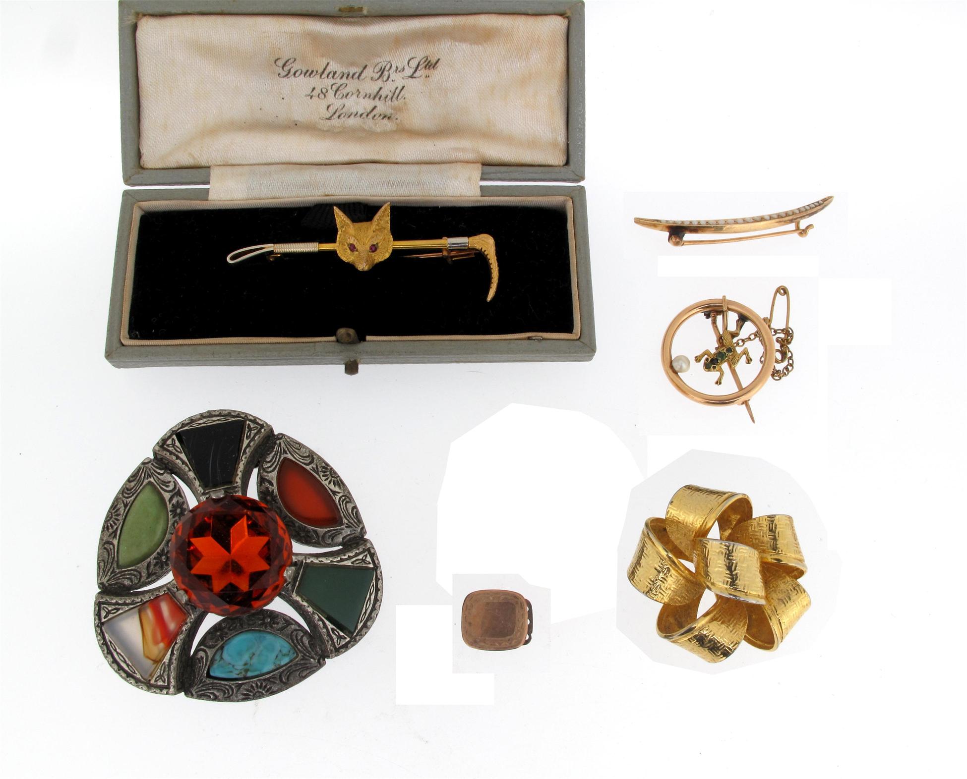 A gold fox mask and riding crop bar brooch, the realistically formed mask with ruby eyes and three colour gold riding crop, cased. And a gold frog and pearl mounted circular gold brooch, the frog set with small rubies and various items of jewellery, costume jewellery etc.