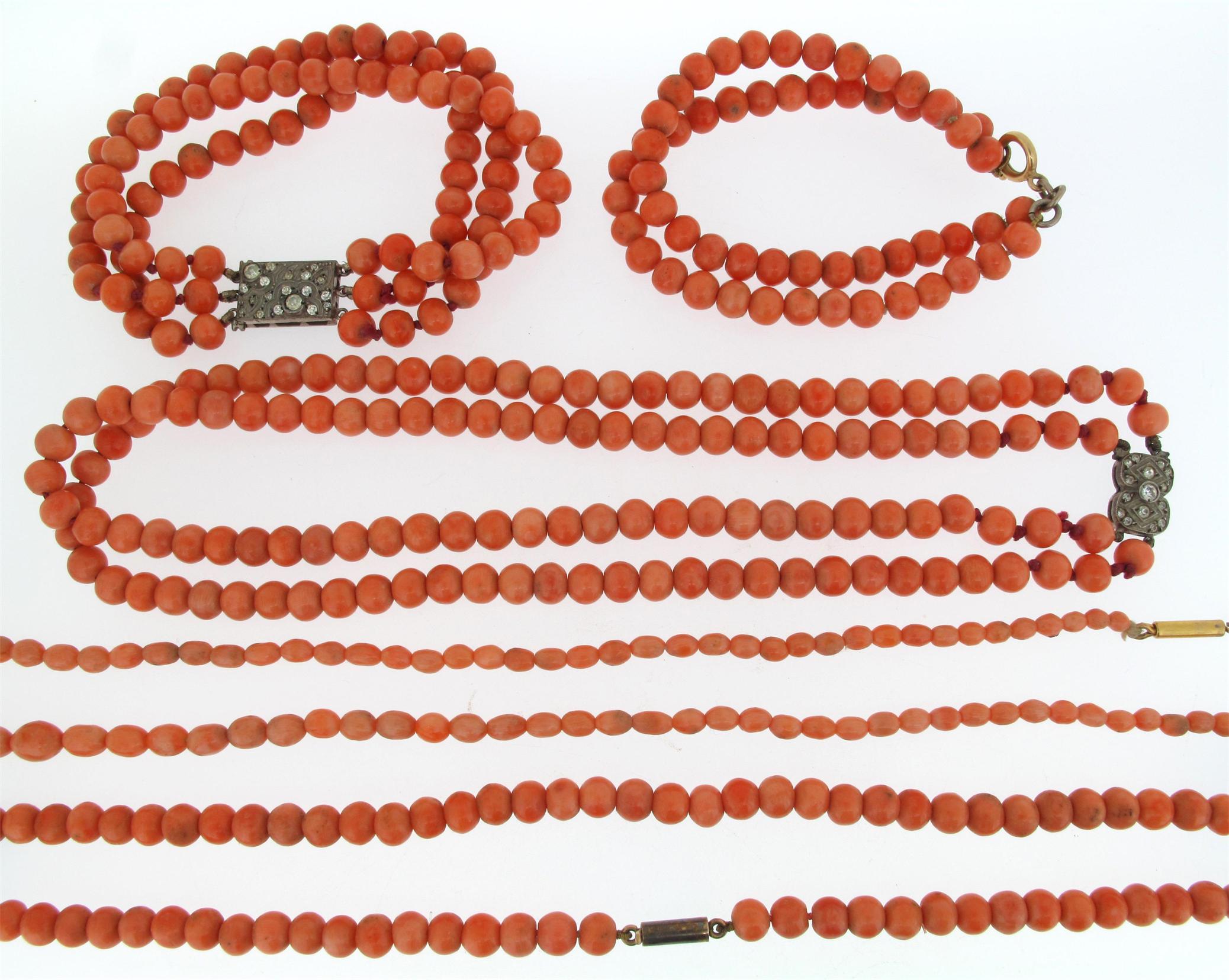 A two row coral bead necklace, with two single row coral bead necklaces and two coral bead braclets.