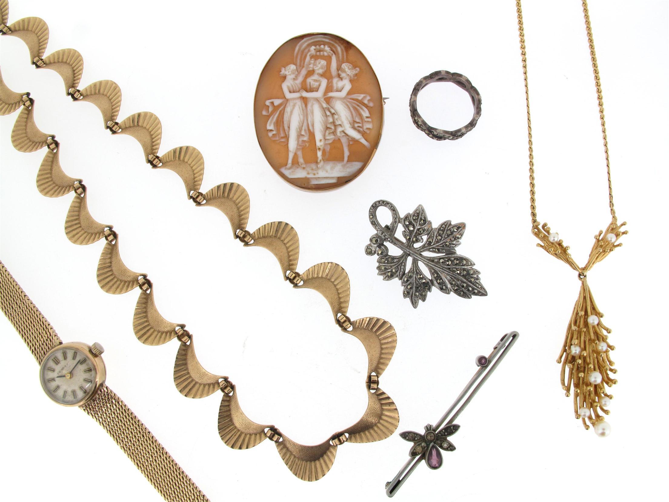 A lady's 9ct gold wristwatch by Certina with a 9ct integrated yellow gold band, a yellow gold scroll link necklace and a yellow gold pendant set with cultured pearls on a fine link yellow gold chain. 25g (2)
