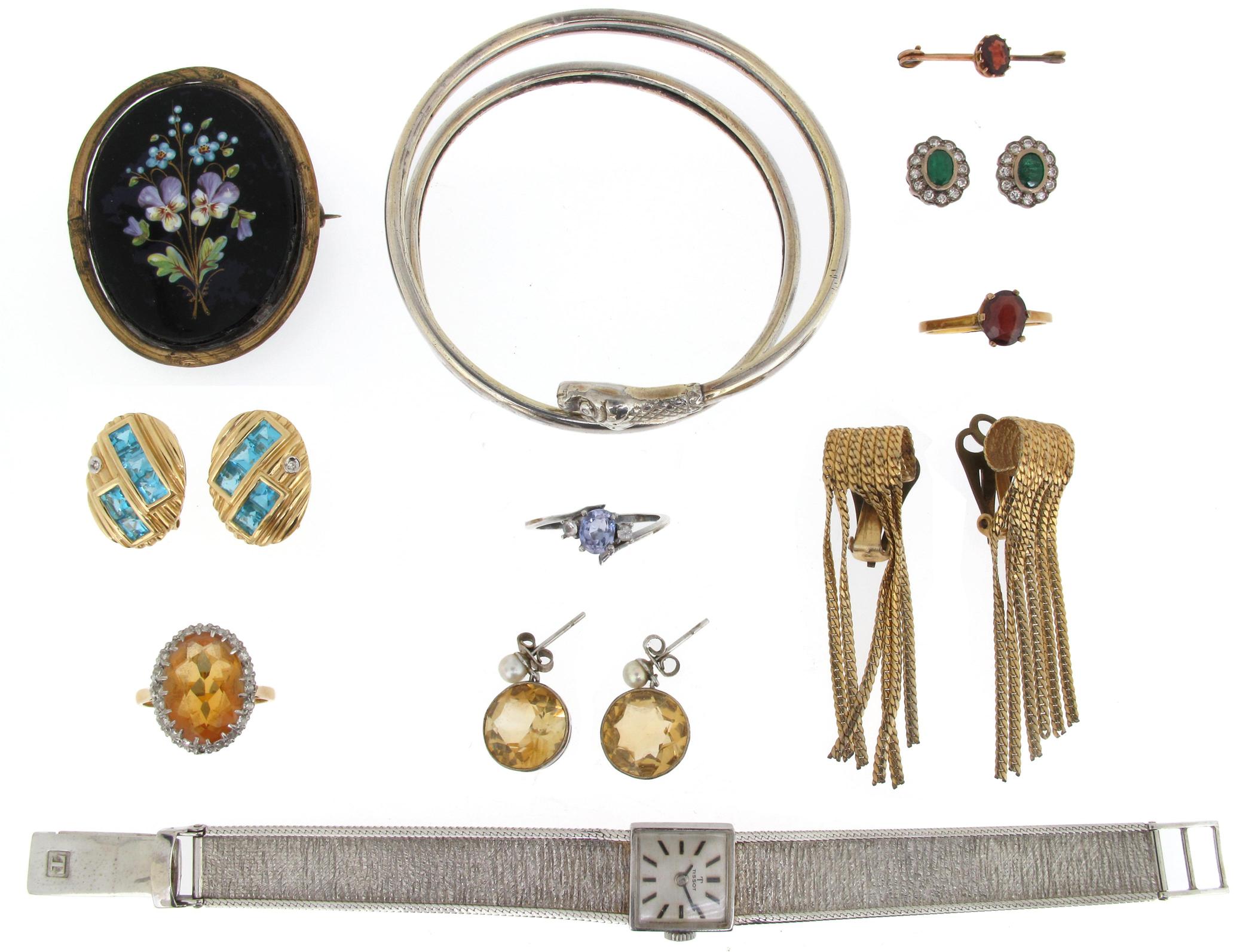 A lady's 9ct gold wristwatch by Tissot, a pair of emerald and diamond set cluster ear studs, an oval shaped citrine and diamond set gold ring, a pair of square shaped blue stone set gold earrings, two other pairs of earrings, two rings, two brooches and a snake bangle.