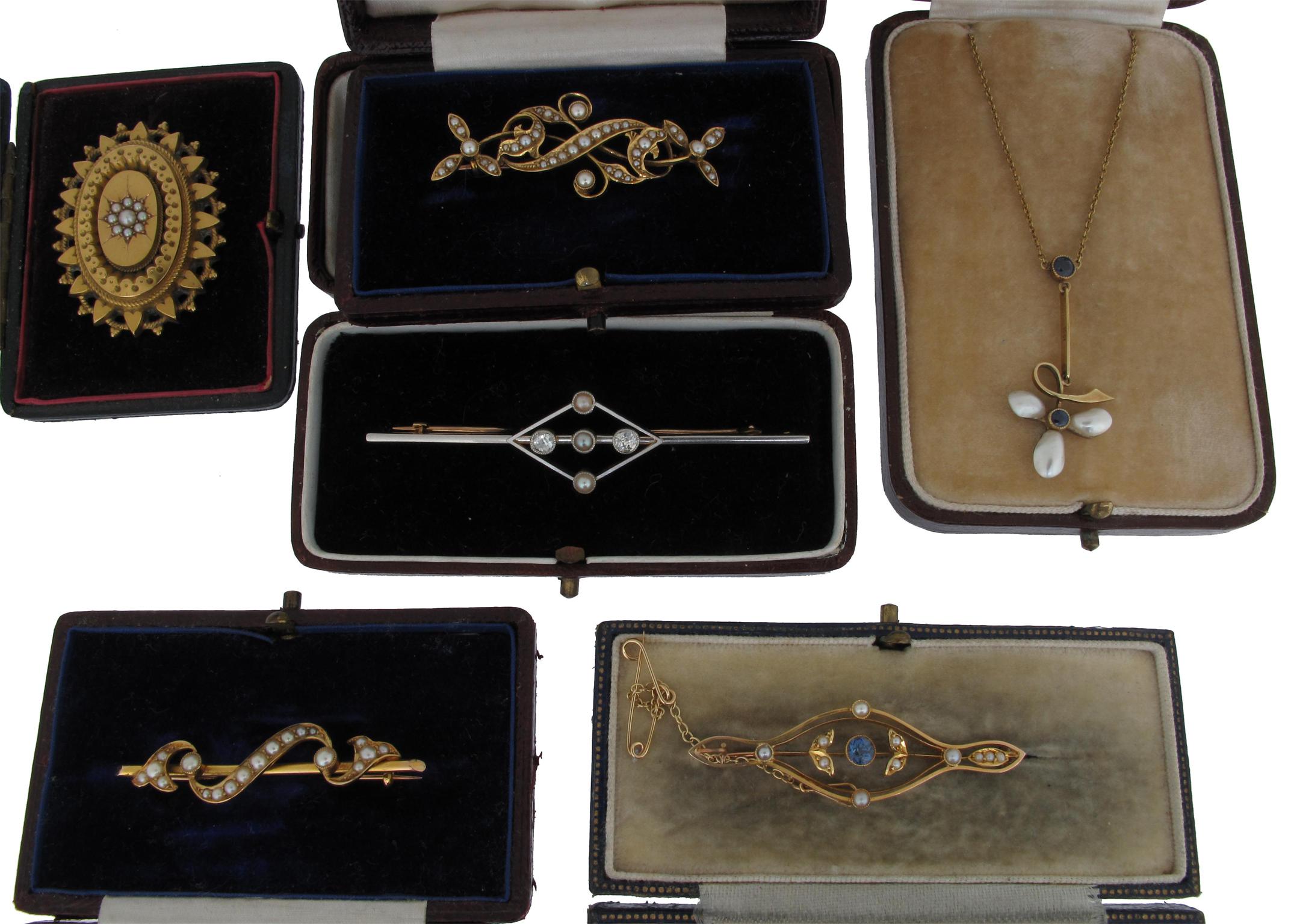 An Edwardian gold pendant mounted with three pearls and two sapphires, on a fine link gold neck chain. Fitted case. A platinum and gold bar brooch mounted with two diamonds and three seed pearls, cased. A Victorian gold brooch set with a cluster of graduated seed pearls and glazed locket compartment to the reverse, two further Edwardian and seed pearl set gold brooches, cased and an Edwardian gold brooch set with a sapphire and seed pearls.