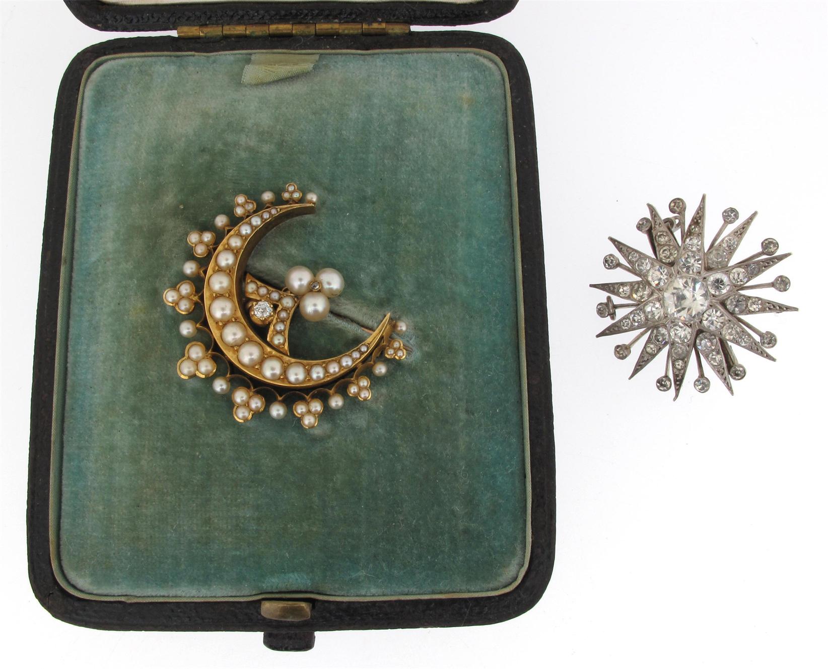 An Edwardian gold crescent brooch, graduated seed pearls and two small diamonds. And a paste set star brooch.