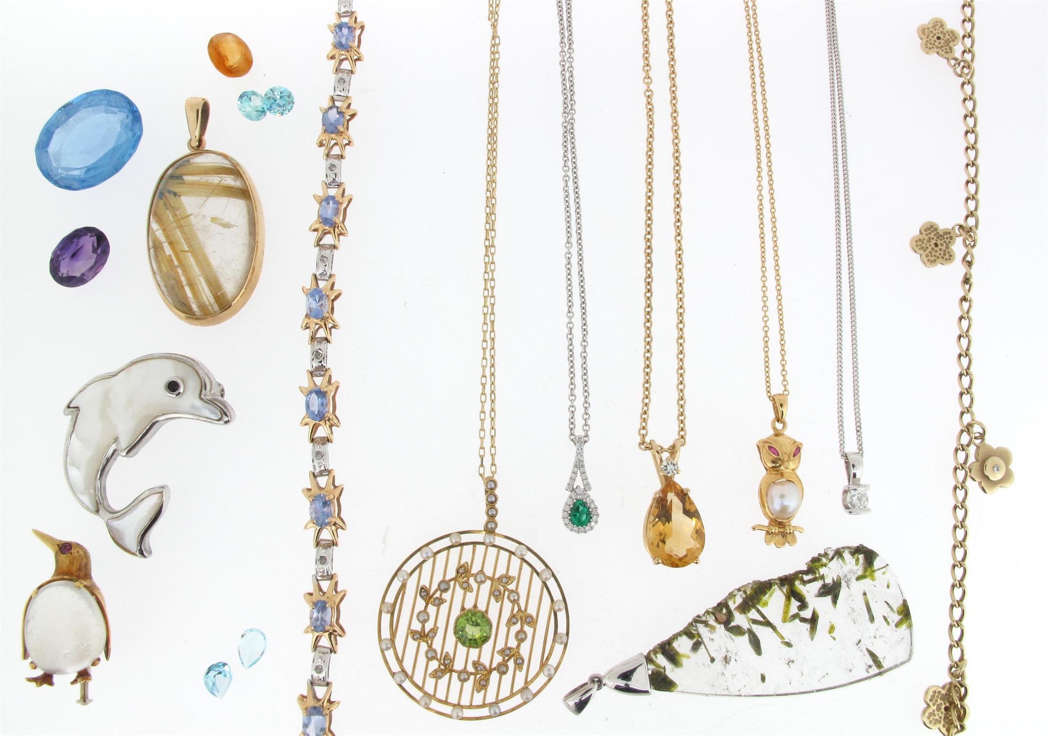 A moonstone and ruby set gold penguin brooch, an Edwardian peridot and seed pearl set gold pendant on a fine link gold chain, seven other assorted pendants with chains, two bracelets, a brooch and seven loose stones.