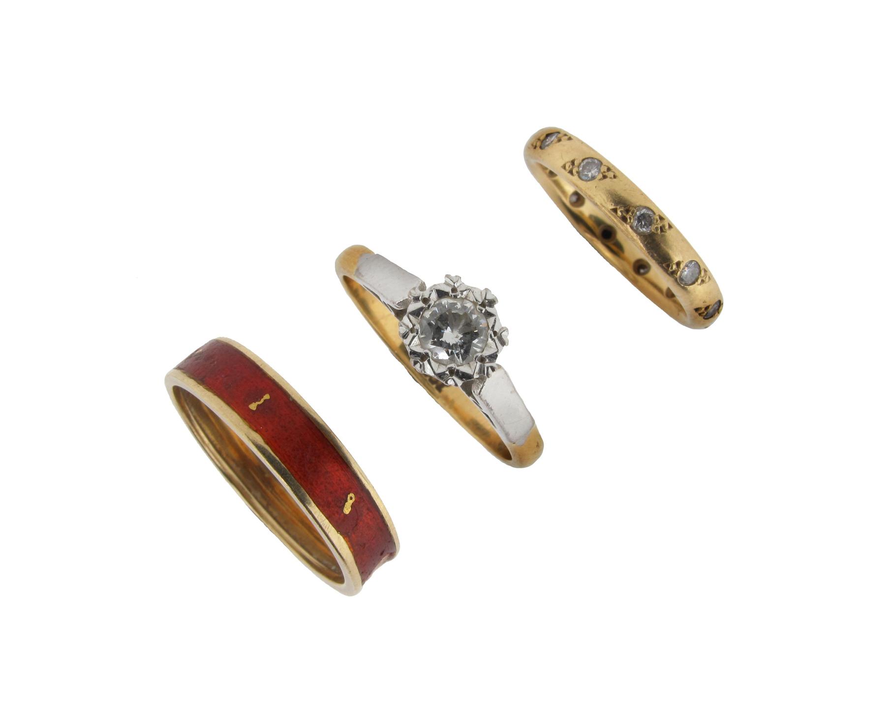 A diamond solitaire ring, set in yellow and white gold. A gold ring with damaged red enamel decoration and a gold eternity ring set with small circular cut diamonds.