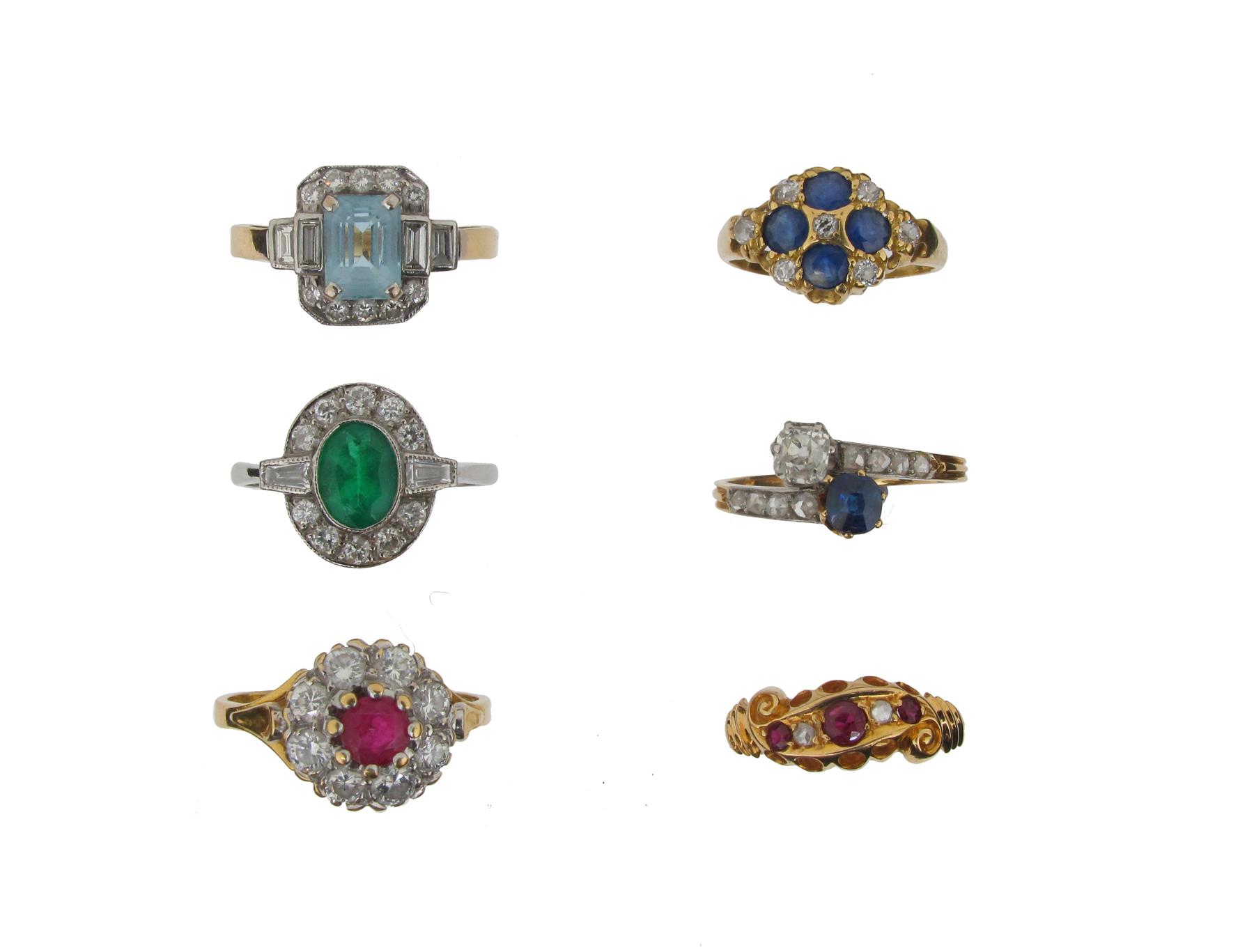 An emerald and diamond cluster ring, the oval shaped emerald is set within a surround of ten circular cut and two tapered baguette shaped diamonds in white gold. Size O. And five other diamond and gem set gold rings.